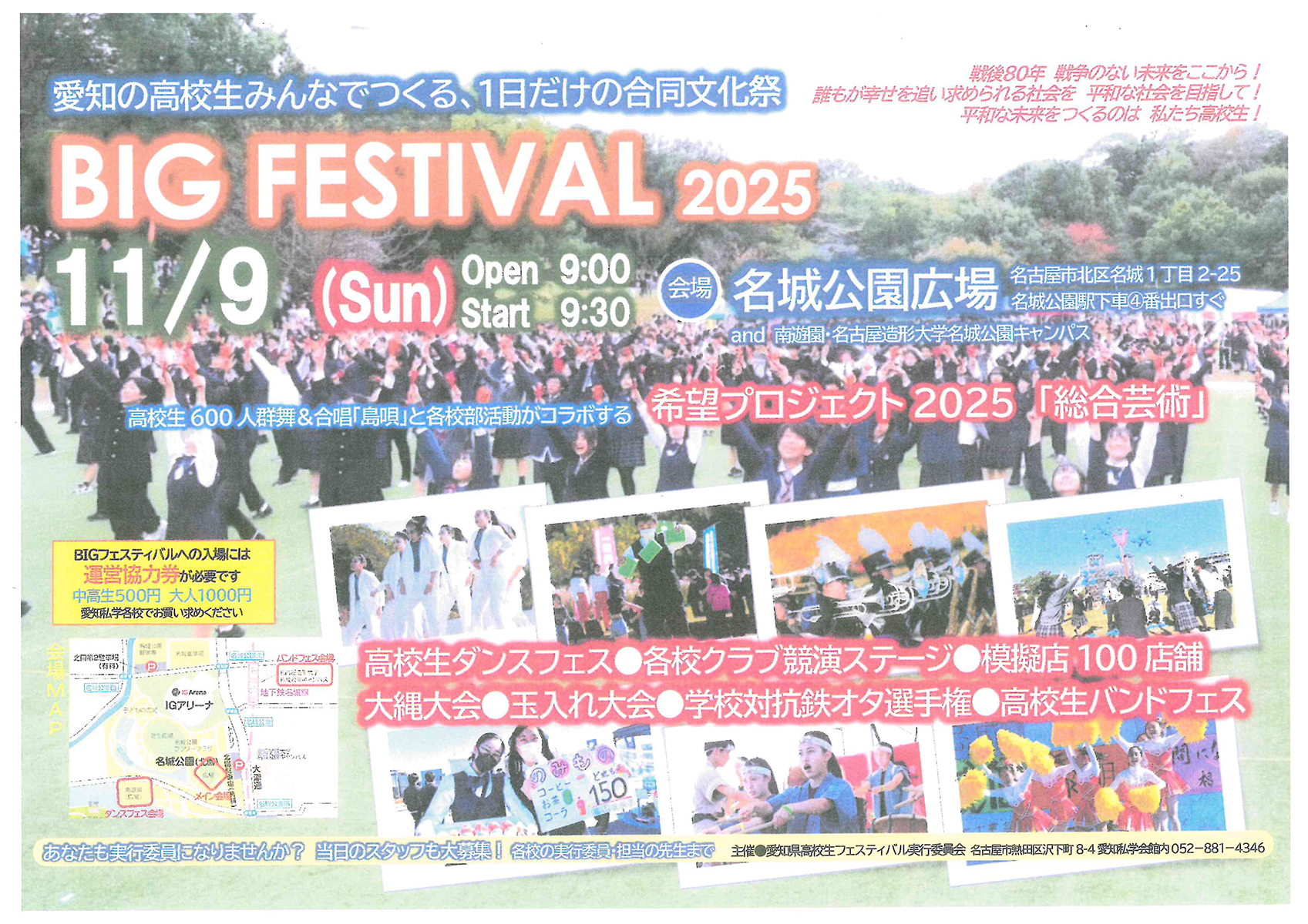 | 内容 | ◎希望プリジェクト2025 宮沢和史さん(元THE BOOM)とともに 合唱・群舞「島唄」 ◎高校生ダンスフェスティバル ◎各校クラブ発表ステージ ◎バンドフェスティバル ◎模擬店・縁日企画 ◎大縄跳び&玉入れ大会 |