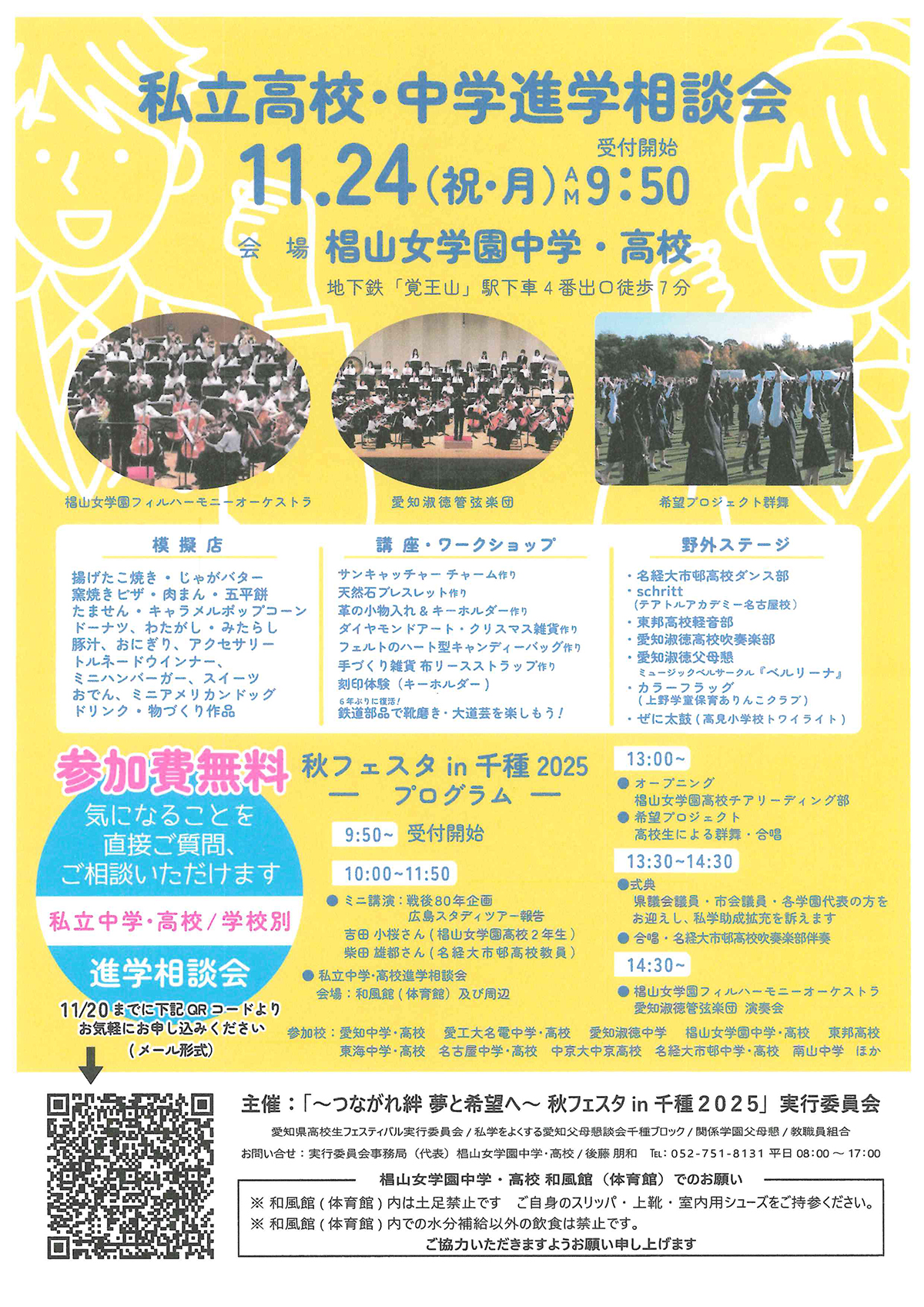 11月242025 2025年11月 【千種】秋フェスタ in 千種2025 開催日11月24日(月・振休) 会場椙山女学園 開場10:00 式典13:00〜14:30 チラシ【PDF】 チラシ【PDF】