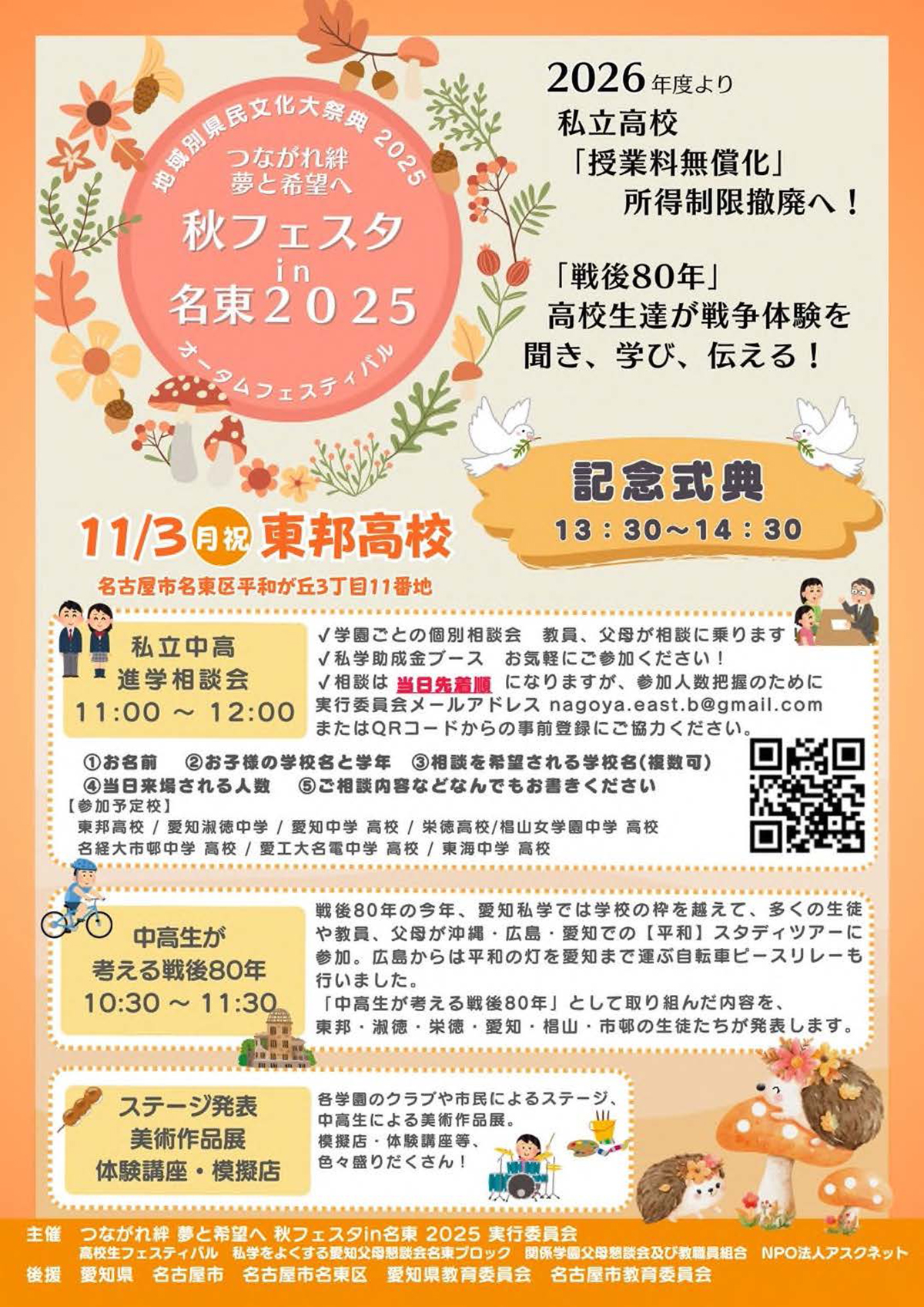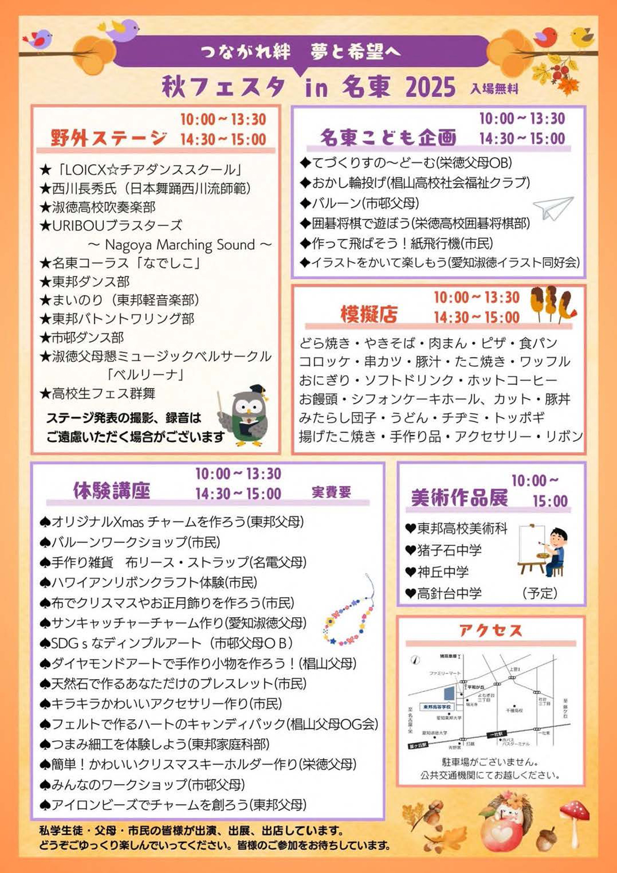 11月032025 2025年11月 【名東】つながれ絆 夢と希望へ 秋フェスタ in 名東2025 開催日11月3日(月・祝) 会場東邦高校 開場10:00 式典13:30〜14:30 チラシ【PDF】